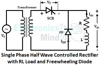 The time of conduction depends upon the value of load inductance. Thus supply positive voltage appears across the load and thus even negative voltage reaches the load. In order to stop the negative voltage wave to reach the load or to prevent the instantaneous value of the load voltage to become negative. A free-wheeling or flywheel diode (FD) is connected across the load as shown below.