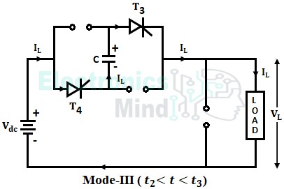 - Mode-III : The thyristors pair T3, T4 are triggered at instant t2. Hence, the load current flows the path Vdc+ → T4 → C → T3 → Load → Vdc– as shown below.
